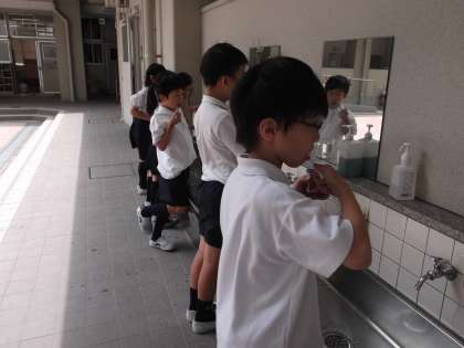6/1から一週間を歯みがき強調週間として、給食後に健康委員会の児童が『歯みがきタイム』の放送をしています。音楽は『プラークねらいうち』で軽快な曲です。