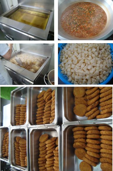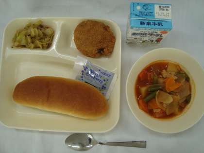 「チキンレバーカツ ケチャップ煮 たことキャベツのバジルソテー コッペパン 牛乳」
