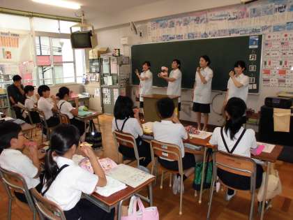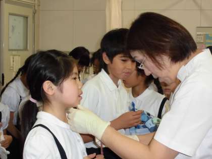 学校歯科医の中谷先生、大阪市教育委員会の歯科衛生士の先生、なにわ歯科衛生士専門学校の学生のみなさんに、全校児童の歯みがき指導とフッ素塗布をしていただきました。