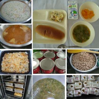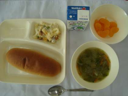 「マカロニグラタン レタスのスープ みかん(缶)黒糖パン 牛乳」