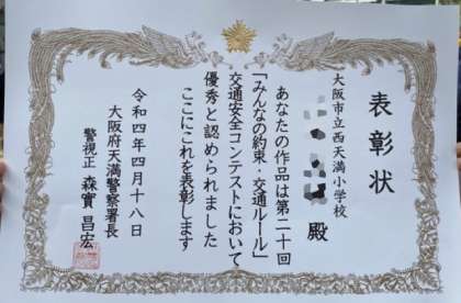 「みんなの約束?交通ルール」に応募した作文の中で優秀者に天満警察署から表彰がありました。