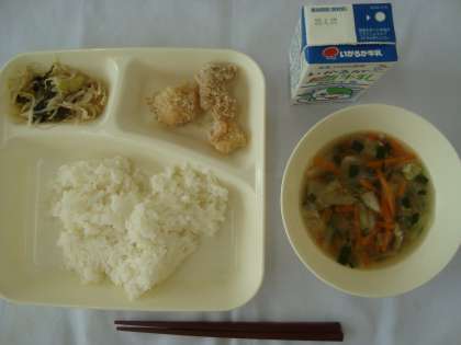「鶏肉のからあげ 中華スープ チンゲンサイともやしの甘酢あえ ごはん 牛乳」
