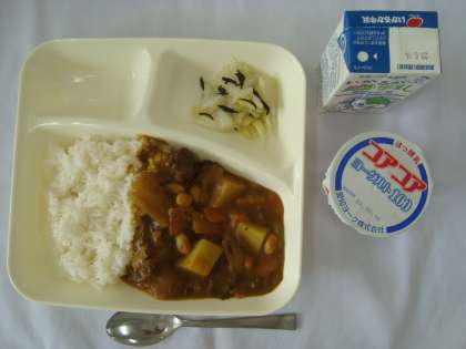 「牛肉と大豆のカレーライス キャベツのひじきドレッシング ヨーグルト 牛乳」