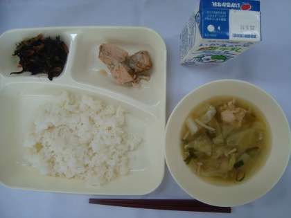 「さけのごまみそ焼き 五目汁 ひじきのいため煮 ごはん 牛乳」
