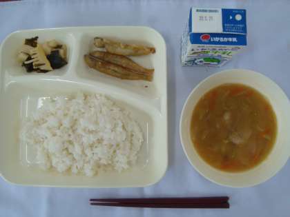 「きびなごてんぷら 豚汁 わかたけ煮 ごはん 牛乳」