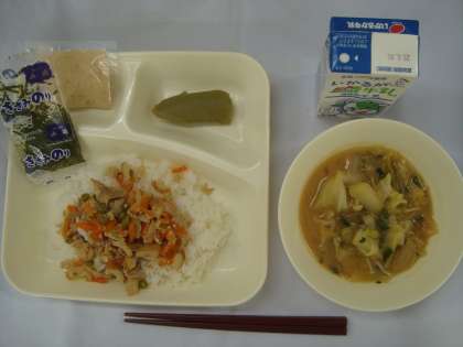 「かやくご飯 じゃがいものみそ汁 まっ茶ういろう 牛乳」