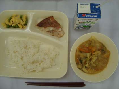 「赤魚のしょうゆだれかけ みそ汁 グリンピースの卵とじ ごはん 牛乳」