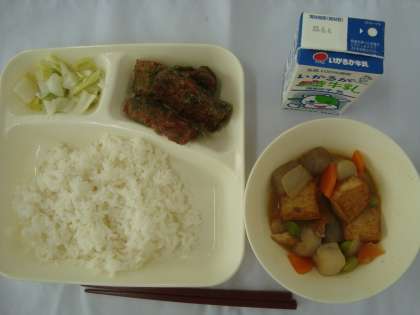 「ちくわのいそべあげ あつあげとさといものみそ煮 あっさりキャベツ ごはん 牛乳」