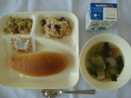 「金時豆の中華おこわ 中華スープ ツナと野菜のオイスターソース パン アプリコットジャム 牛乳」
