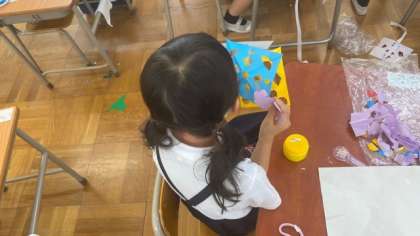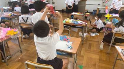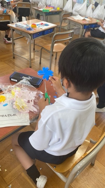今日は、いろんな飾りを作りました。折り紙を半分に折って、さまざまな模様に切って、開けると面白い形が完成しました。