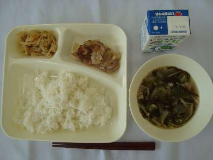 「豚肉の甘辛焼き もずくとオクラのとろり汁 切り干しだいこんのいため煮 ごはん 牛乳」
