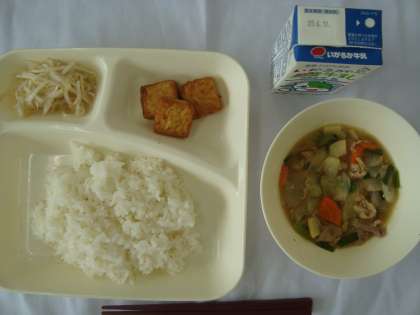 「中華煮 あつあげのピリ辛じょうゆかけ もやしの中華あえ ごはん 牛乳」
