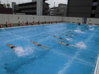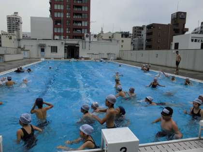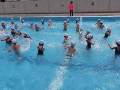 5、6年は、水慣れをしてから、けのびやバタ足、クロールをして泳ぎました。また、みんなでじゃんけん列車をして楽しみました。