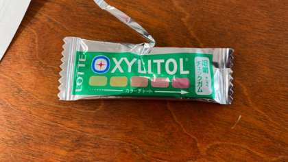 たくさん噛むと色が変わるガムで実験です。ピンク色に変わるとしっかり噛めている証だそうです。