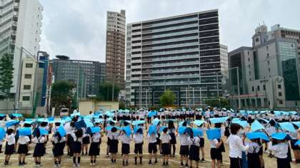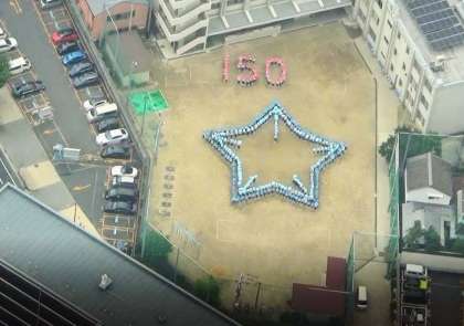 上空から見て、綺麗に校章が見えました。カメラマンの方も西天満小学校の児童は、まっすぐ並べていてすごいと誉めていただきました。
