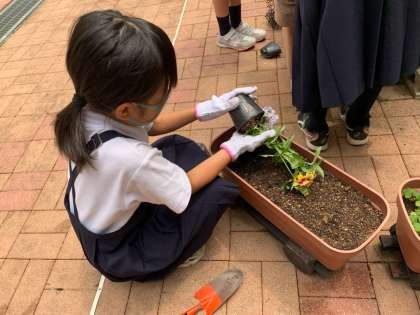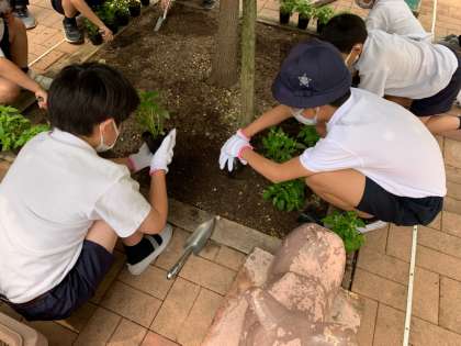 環境委員会の児童が、中庭に花を植えました。花の種類を選ぶところから自分たちで考え、今日は配置も一生懸命考えました。150周年を迎える学校をきれいにするために委員会の一人一人ががんばっています!