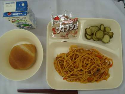 「スパゲッティーミートソース きゅうりのピクルス アーモンドフィッシュ パン 牛乳」