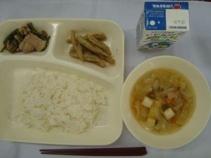 「いわしてんぷら 五目汁 豚肉とさんどまめのいためもの ごはん 牛乳」