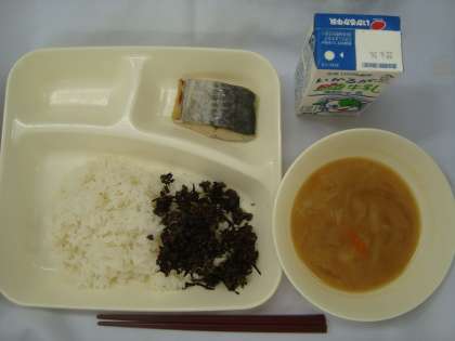 「さごしの塩焼き みそ汁 牛ひじきそぼろ ごはん 牛乳」
