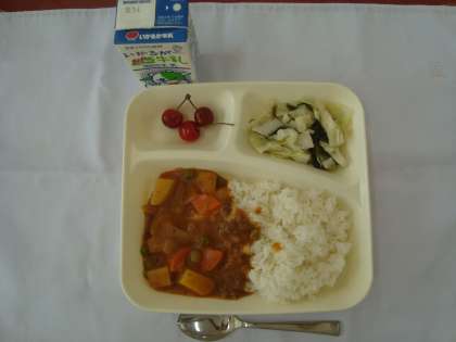 「ハヤシライス ミックス海そうのサラダ さくらんぼ 牛乳」