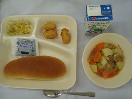 「いかてんぷら フレッシュトマトのスープ煮 サワーソテー パン ブルーベリージャム 牛乳」