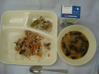 「豚ひき肉とにらのそぼろ丼 みそ汁 キャベツの赤じそあえ ごはん 牛乳」