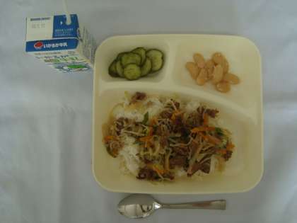 「牛丼 きゅうりのしょうがづけ 大福豆の煮もの 牛乳」