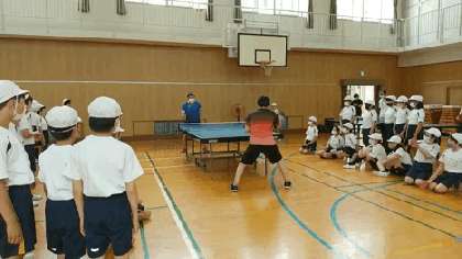 今日は、トップアスリート夢授業として、卓球の新井周選手をお招きして、指導を受けました。新井選手は、アテネ五輪に出場経験があり、トップアスリートとしての高い技術を見せてもらいました。