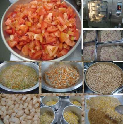 「鶏肉とてぼ豆のスープ煮 じゃがいもとトマトのチーズ焼き もやしとコーンのソテー コッペッパン りんごジャム 牛乳」