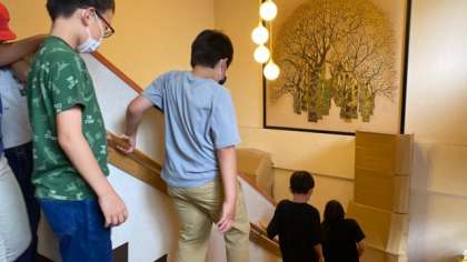 ご飯を食べ終わり、避難訓練をしています。