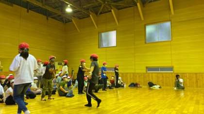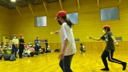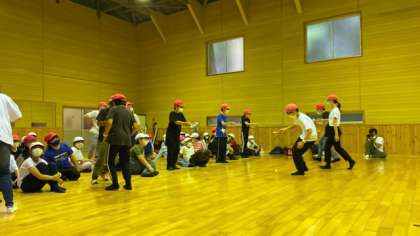 ?まずは、ピンポン玉リレーです。スプーンにピンポン玉を乗せて落とさずに運びます。活動班で協力して楽しんでいます!
