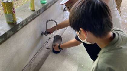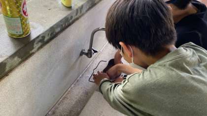 片付けをしています。鍋の底についた煤を取ることに苦労しています。
