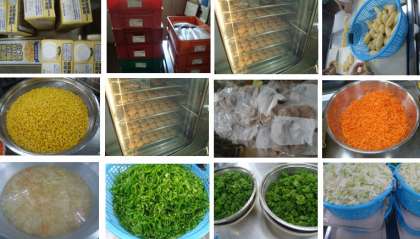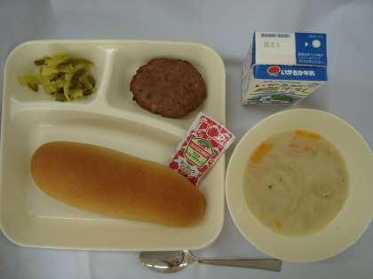 「焼きハンバーグ 豆乳スープ キャベツとピーマンのカレーソテー 黒糖パン 牛乳」