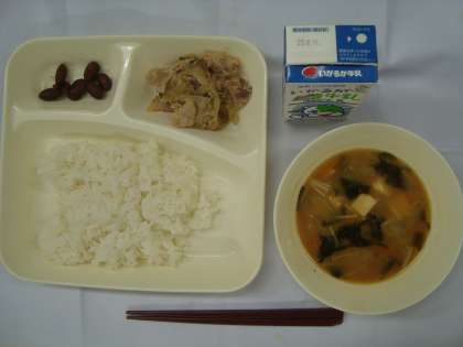「豚肉の甘辛焼き みそ汁 金時豆の煮もの ごはん 牛乳」