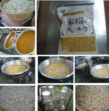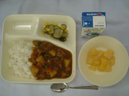 「チキンカレーライス(米粉) きゅうりとコーンのサラダ 白桃 ごはん 牛乳」