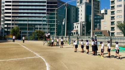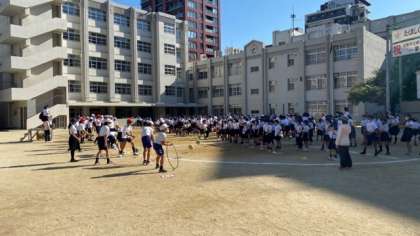 今日は、たてわり班でフープに向かってボールを投げ入れる競争をしました。
