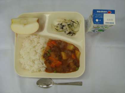 「ハヤシライス(米粉) キャベツのひじきドレッシング りんご 牛乳」
