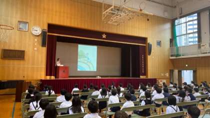 また、朝会の後半は、ある6年生が書いた唱歌「ふるさと」の説明を紹介しました。「うさぎ追いし、かの山〜」など、歌詞に合わせてイラストが描いてあり、低学年でも分かりやすい説明になっていました。