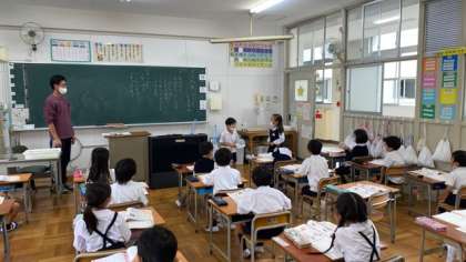 「どんな あいさつを しますか」という教材文を読んで、勉強しています。実際にあいさつを実演してみて気持ち良いあいさつの仕方を学びました。