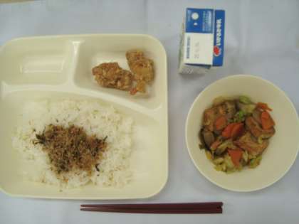 「鶏肉のたつたあげ あつあげと野菜の煮もの おかかなっ葉 ごはん 牛乳」