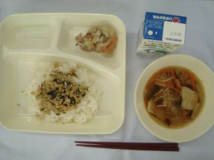 「鶏肉のゆず塩焼き ソーキ汁 ツナ大豆そぼろ ごはん 牛乳」