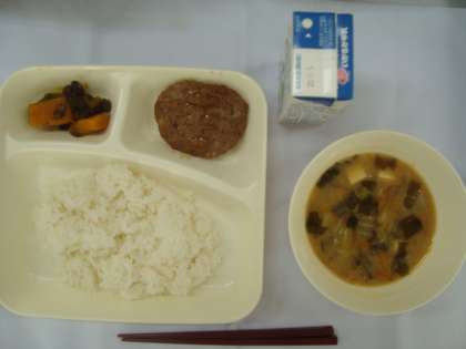 「和風ハンバーグ みそ汁 かぼちゃのいとこ煮 ごはん 牛乳」