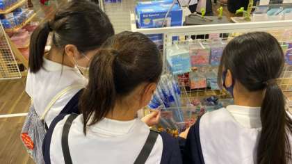 水族館のお土産ショップで、お土産を探しています。「どれにしようかなぁー」と心を弾ませています!