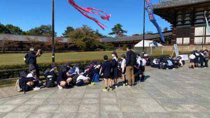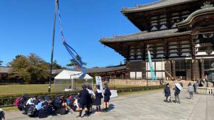 東大寺に到着しました。東大寺の本堂前で事前にグループで調べたことをみんなに伝えました。