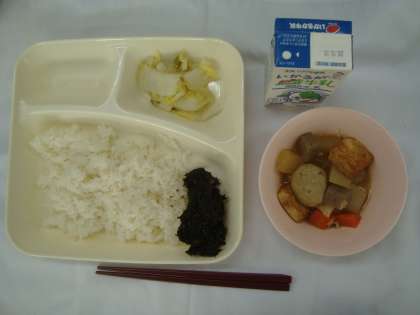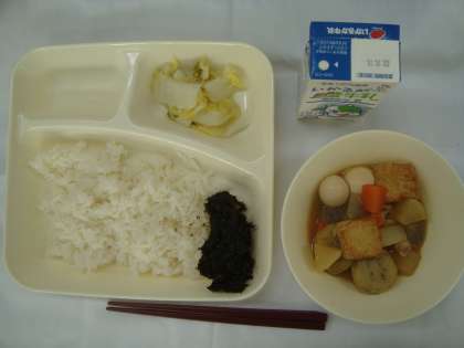 「関東煮(個別対応:うずら卵) はくさいの甘酢あえ のりのつくだ煮 ごはん 牛乳」