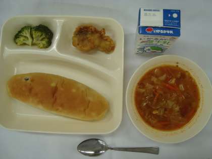 「白身魚のフリッター ミネストローネ ブロッコリーのサラダ おさつパン 牛乳」