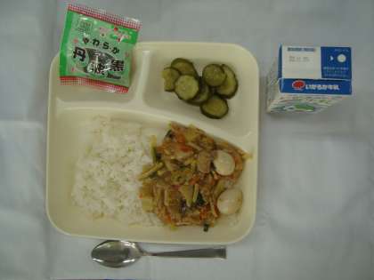 「中華丼(個別対応献立:うずら卵) きゅうりのピリ辛あえ ソフト黒豆 牛乳」