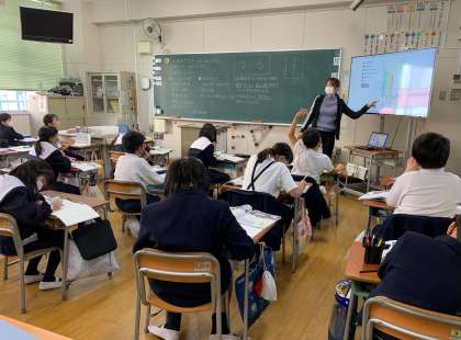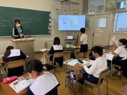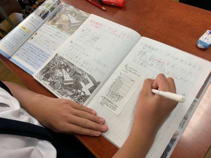 社会科の学習で、地域の防災リーダーがどのような活動をしているかや、どうして防災リーダーが必要なのかを考えました。棒グラフから読み取れる情報もしっかりとノートにまとめることができました。
