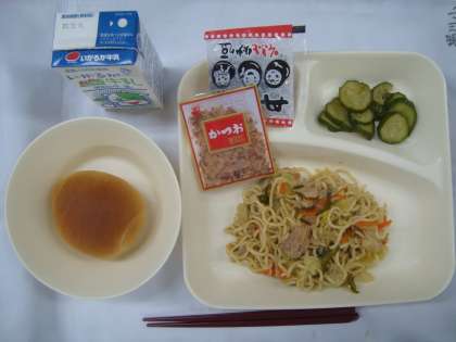 「和風焼きそば きゅうりのしょうがづけ、いり黒豆 パン 牛乳」