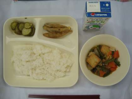 「きびなごのてんぷら あつあげと野菜の煮もの きゅうりの甘酢づけ ごはん 牛乳」
